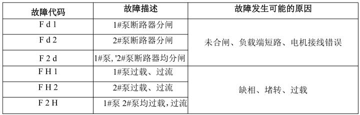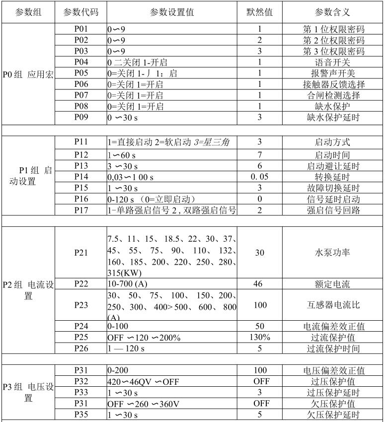 當數(shù)顯屏顯示 P01 參數(shù)代碼時,按《2 泵啟動》鍵與《2 泵停止》鍵可以找出其它參數(shù)代碼,當按《1 泵停止》鍵進入該參數(shù)的當前設置值,通過按《2 泵啟動》鍵與《2泵停止》鍵進行修改,再通過按《主 /備選擇》鍵返回到當前參數(shù)代碼。設置完所有的參數(shù)需按《主/備選擇》鍵退出到待機狀態(tài),才會永 久保存修改過的參數(shù)。