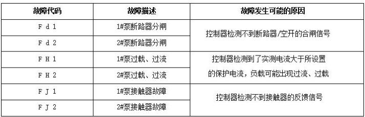 當數顯屏顯示 P01 參數代碼時,按《2 泵啟動》鍵與《2 泵停止》鍵可以找出其它參數代碼,當按《1 泵停止》鍵進入該參數的當前設置值,通過按《2 泵啟動》鍵與《2 泵停止》鍵進行修改,再通過按《 主/備選擇 》鍵返回到當前參數代碼。設置完所有的參數需按《主/備選擇》鍵退出到待機狀態,才會永久保存修改過